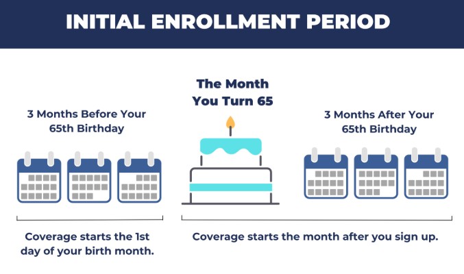 Most people first become eligible for Medicare at age 65. This starts your Initial Enrollment Period, which includes: